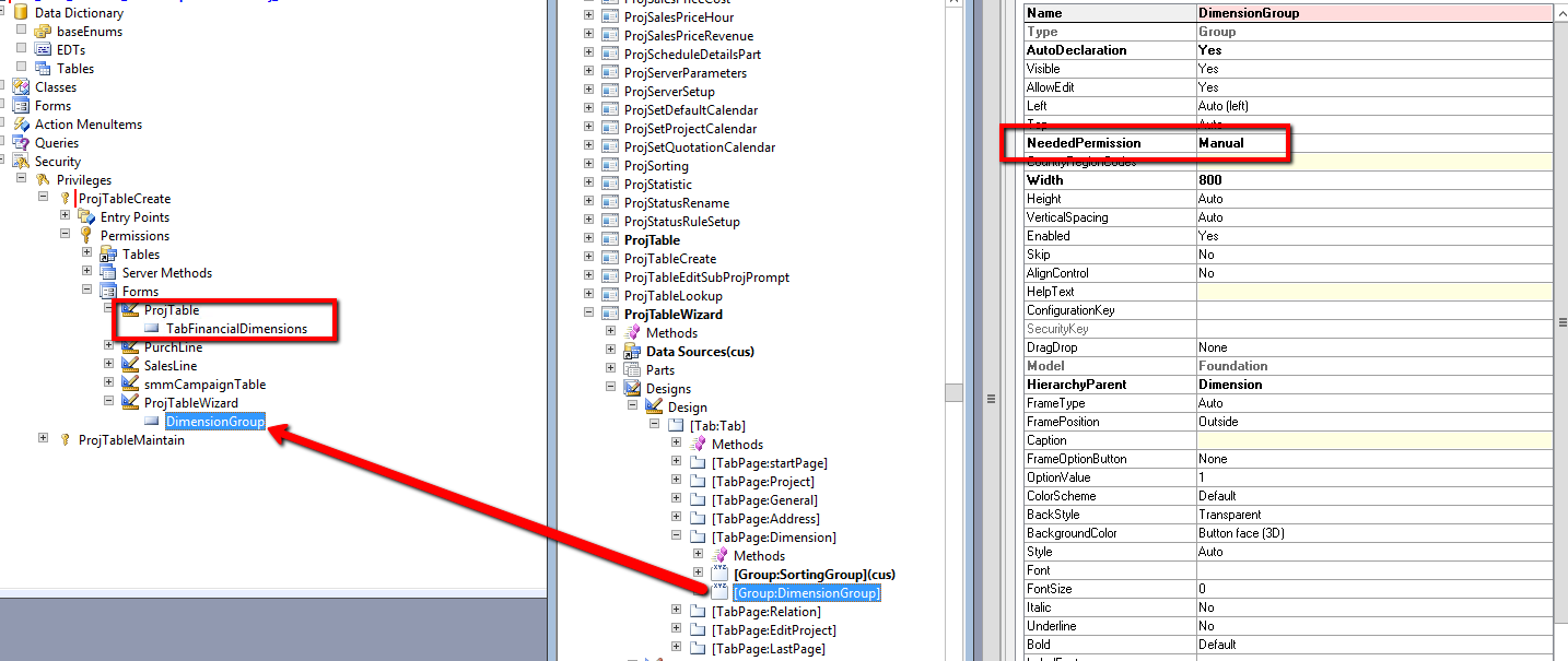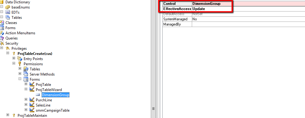 ============== Thanks André I found very fast how to fix access issue to Financial dimensions on Project Wizard form. He explained how to solve a similar problem in this thread https://community.dynamics.com/ax/f/33/t/138100 All detail could be found in MSDN article https://msdn.microsoft.com/en-us/library/gg879980.aspx Briefly we need to add associated form and their form controls to appropriate security privileges or directly to roles. ![]() As we can see DimensionGroup control requires manually set permission. so let's add it in the same way as it done for ProjTable form. ![]() Now Project manager and other roles containing the same privileges will be able not only to view but also to update financial dimensions in the Project Wizard. Источник: http://alexvoy.blogspot.com/2016/04/...imensions.html