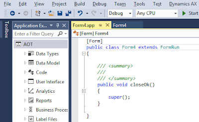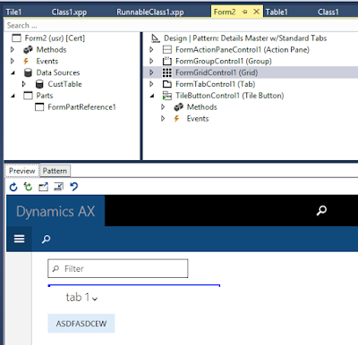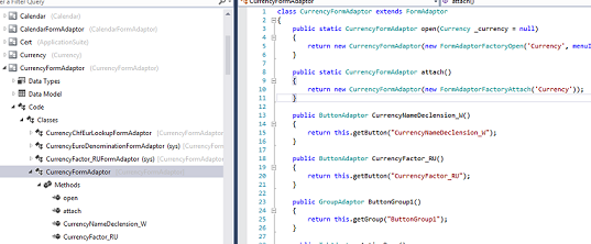 ============== First, AX is no more a WinForms application, it is a website. There is no "AOS” as such, my friends. Though still a couple of Windows services run on the server side: · Batch management services that “Polls and executes AX batch requests.” · DIXF service that “Executes import/export logic for the Microsoft Dynamics AX Data Import/Export Framework”. Disclaimer: All screenshot are made from RTW development box. Other environments’ settings may differ. ![]() Browser is now your main client and the third tier remains SQL Server or SQL Azure, at least for now J The website contains parameters for DB connection and for binary directory with business logic and metadata. You may find them in website’s Application Settings along with lots of other interesting parameters. UI development experience The good news is that you do not have to learn HTML 5 and all this web-stuff to develop AX. UI development experience has not changed that much. Rendering of your forms is done by IDE and Runtime. The only exception is development of custom controls if standard ones do not cover your needs. That is where you’ll have to exercise in web development. IDE now provides a nice relevant form preview feature. FormRun Unlike in older versions every form is now a separate class that extends FormRun and is decorated with [Form] attribute. That opens new perspectives for OOP usage in your UI development. For example, your form can now implement interfaces, that may be convenient in caller patterns or in extensions if you want all your forms to behave similarly. Physical form For those interested in HTML / CSS / JavaScript / Bindings internals, here is a sample HTML source of a simple form received by browser may be found here. There are some wonderful things like: Even the simplest form is rendered to almost 200Kb HTML. You can also see a draft form metadata when the option “Build pre-compiled forms” is set in Build models dialog. Visual Studio pre-generates JSON form file to increase runtime performance. Click here to open the full JSON file text. Forms patterns This is an important innovation to forms development – strict patterns that you must follow in order to compile your form. IDE gives a nice tree-arranged details on the expected form structure that must adhere to the chosen pattern. Some patterns resemble those in AX 2012 but there many more. Additionally, some controls like Groups may have their own subpatterns that depend on the parent form's pattern. Form adaptors In Project properties you can choose to automatically generate form adaptor class that extends standard FormAdaptor and resides in a separate package referencing the form’s package. It’s probably intended to contain all form-related business logic, though I have not seen the description of this BP. Well, you can always find an example in standard code like in the example with Currencies below: Dissappoiting news Two bad news for those who invested heavily into rich UI. The following items are not supported in AX 7: