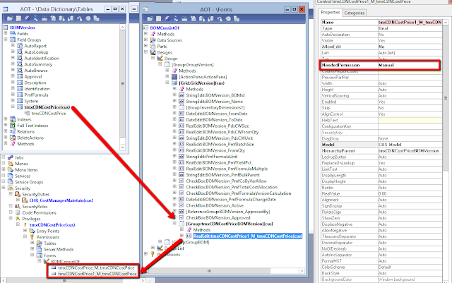 ============== Basically to restrict access to a field group it is enough just to set its NeededPermission property, say, to Manual and then you can provide your users with a special privilege on this form control. However, when it comes to a grid, it is not enough: you also need to change the same property and needed permission on all included fields or, like in my scenario, display methods. Some helpful articles Security Permissions Properties for a Form How to restrict access to a button Источник: http://alexvoy.blogspot.com/2016/10/...m-control.html