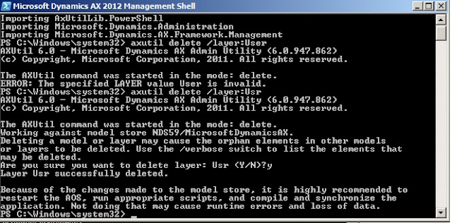 ============== How to delete layers in Ax 2012: 1. Go to Start-> Administrative tool-> Ax 2012 management shell 2. For example we want to delete user model so type following command: axutil delete /layer: usr 3. and press enter and put y when prompt for confermation of deletion as shown in secrren shot Note: Take the back up before exicuting this command and try this first on test server Happy coding !!!!! Источник: http://axaptacorner.blogspot.com/201...n-ax-2012.html