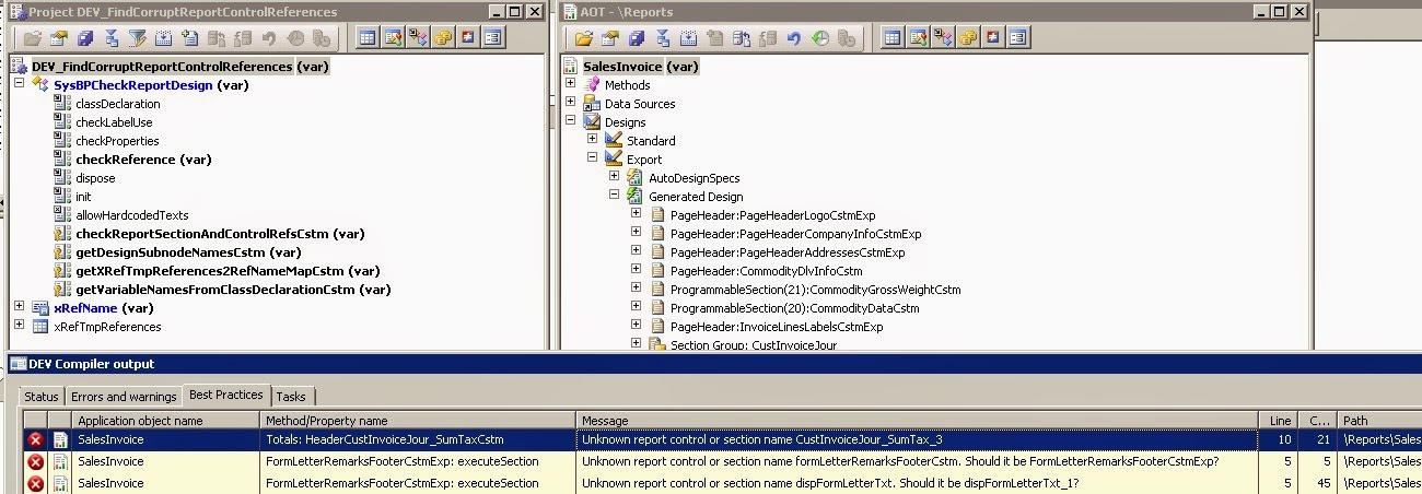 ============== Sometimes new report designs are created by duplicating original ones. AX adds postfixes to cloned controls automatically to keep names unique, but should there be any references to report controls in the code (say, in executeSection methods), those must be fixed manually. If this is not done, there will be no compilation errors, but the code in the new design will point to report controls located under the original design, which does not make sense at run time. I have customized SysBPCheckReportDesign class to check if the code must be fixed in the new design. The customization is based on the standard cross-reference functionality. There was one issue with that: some report control names were cut in the xRefTmpReferences table, so xRefName EDT had to be extended. xRefTmpReferences table is not customized, but it is included to the project, as it should be re-compiled after the project is imported and data dictionary is synchronized. You can find the XPO here. And this is what the imported project and the new BP errors look like: Источник: http://sashanazarov.blogspot.com/201...or-report.html