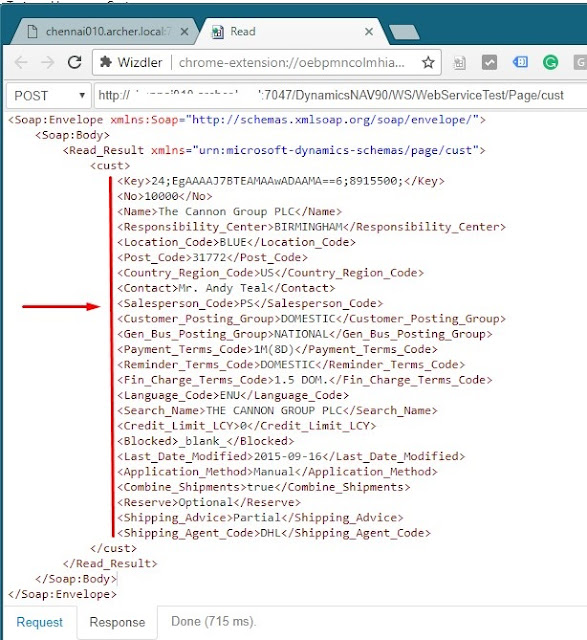 ============== Hi Readers, I am working a web Service project with a customer and having trouble in communication because from NAV we actually do nothing related to web service publishing. ![]() Let me try to explain the problem - If a customer request you to publish a page as web services, for example, "Customer List" Page what we do. 1. We open Web Services page. 2. Add a New record, of Type Page and ID 22 and give a Service Name like cust. 3. Share the URL with the customer. Now, what if the customer says, there we are unable to consume it to Read, Read Multiple and other web service functions what to do??? Let's discuss some of my findings. What we do to start with is add record in web service page as shown below - Next click on URL generated in Navision Web service Page, it will show something like this - What Next, can we test any of these functions easily?? ok so here is what I found. If you use google chrome then there is a Chrome Free addon to test SOAP web services - Wizdler (Install Add-on Chrome using below link) https://chrome.google.com/webstore/d...aagmapififiakb Let's see how to use - 1. Open the Web Service URL in the web browser, it will detail as below. 2. When we open in Google Chrome, we can use Wizdler to access function that web service has as shown below. We will try to use Read function from cust web service published in Navision. 3. After selecting Read, System will open in a new tab, enter the parameter required by the web services. In this case, web services request No. Parameter and let's assign a number which exists in Navision. 4. After clicking on Go as in above screenshot, the system will return all field value that is part of the Navision page web services as shown below. Hope you find the information useful and can use it in your work. Let me know your views if we need to discuss other functions I would be happy to do that. So all thanks to Peter Prikryl, developer of Wizdler. Regards, Saurav Dhyani saurav-nav.blogspot.in Источник: http://saurav-nav.blogspot.com/2017/...-services.html