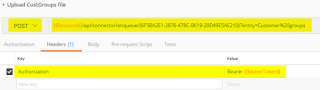 ============== Continuing on the last post, let's do some tests on the D365O recurring integrations with Postman. Initial setup We still need the "GetToken" call as before. Please check on the previous post for information on how to set this up. Next on the D365O data management workspace, we need to create an import and an export projects. To make it simple, let's use the "Customer groups" entity. Create an import project as usual, and you need to create a sample of import file. Once you click the "Upload" button, then click the "Create recurring data job" button at the top. You will then need to: